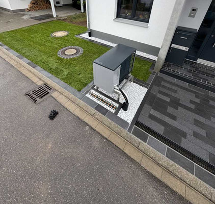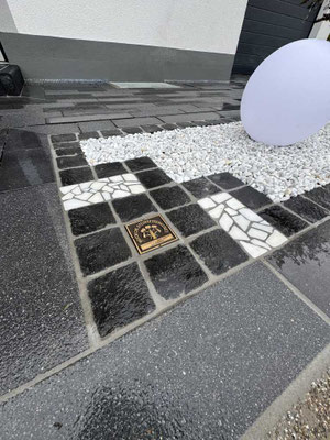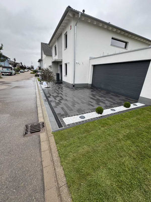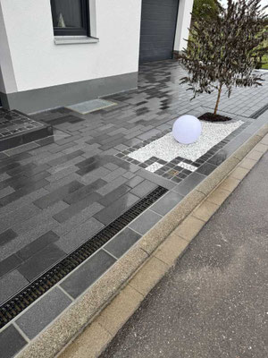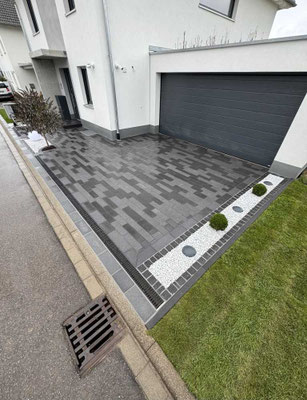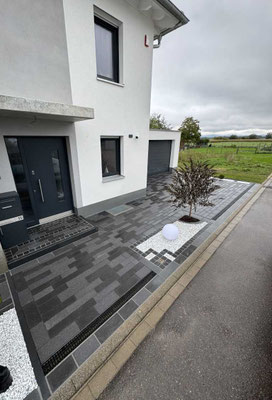 Farblich, an die Fassade angepasst, wurde das Projekt mit Betonpflaster in Kombination mit einem Naturstein Ornament im Gelsomino-Design umgesetzt und mit ein paar feinen Details im Eingangsbereich harmonisch abgerundet.