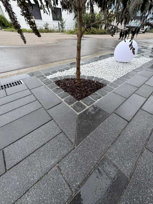 Gartengestaltung realisiert mit Keramikplatten und Granit Natursteinpflaster